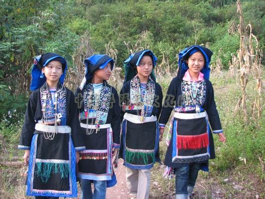 哈尼族女孩們行走在山林小路 臉上堆滿了歡樂