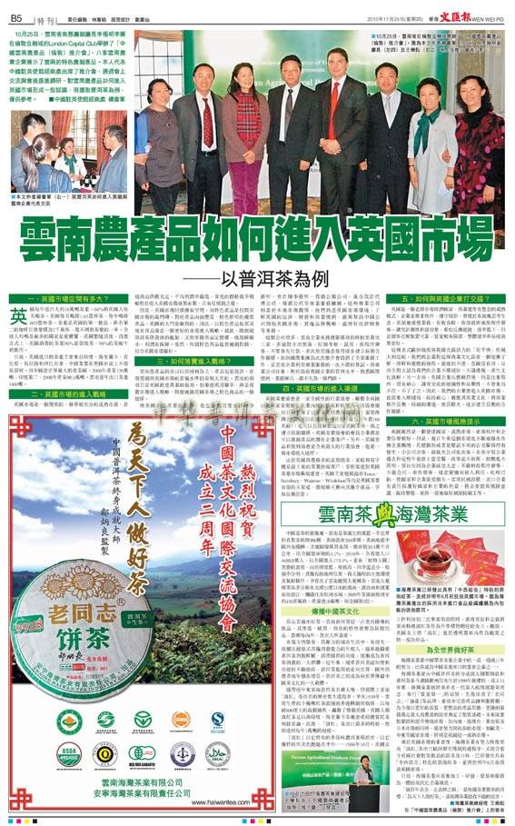 10月25日,云南省商務(wù)廳副廳長李極明率團(tuán)在倫敦金融城的London Capital Club舉辦了「中國云南農(nóng)產(chǎn)品(倫敦)推介會」,八家云南農(nóng)業(yè)企業(yè)展示了云南的特色農(nóng)副產(chǎn)品。本人代表中國駐英使館經(jīng)商處出席了推介會,通過會上交流與會后跟進(jìn)調(diào)研,對云南農(nóng)產(chǎn)品如何進(jìn)入英國市場形成一些認(rèn)識,現(xiàn)選取普洱茶為例,僅供參考。