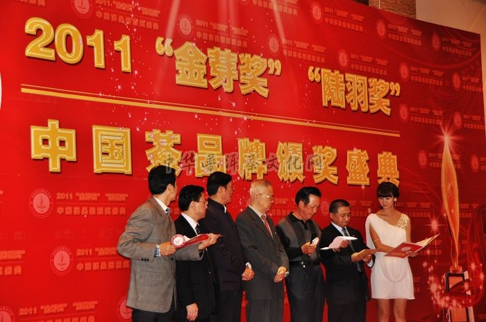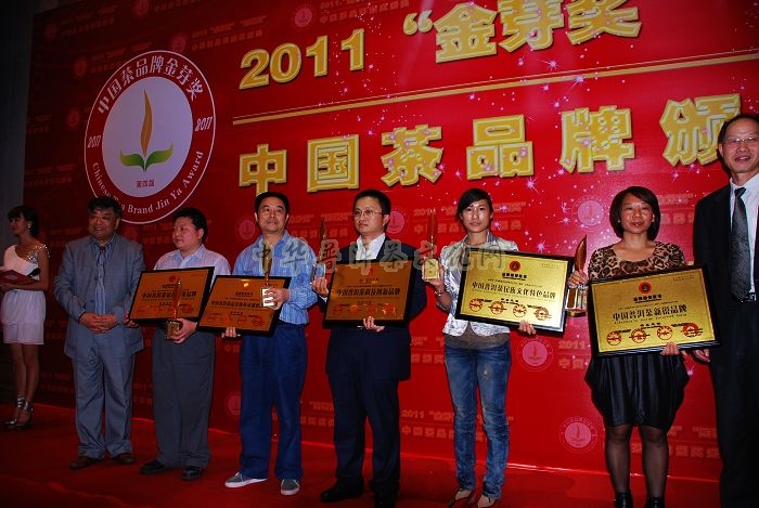 云南普洱茶協(xié)會(huì)會(huì)長(zhǎng)張寶三(左三)在頒獎(jiǎng)盛典上喜獲【2011中國(guó)茶行業(yè)特別貢獻(xiàn)獎(jiǎng)】