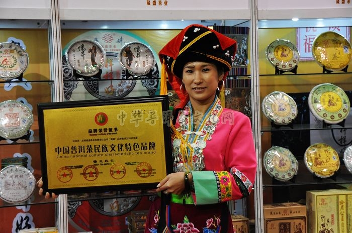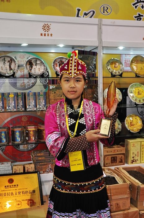 葳盛茶業(yè)分公司經(jīng)理李朝薈手舉“中國(guó)普洱茶民族文化特色品牌”獎(jiǎng)牌